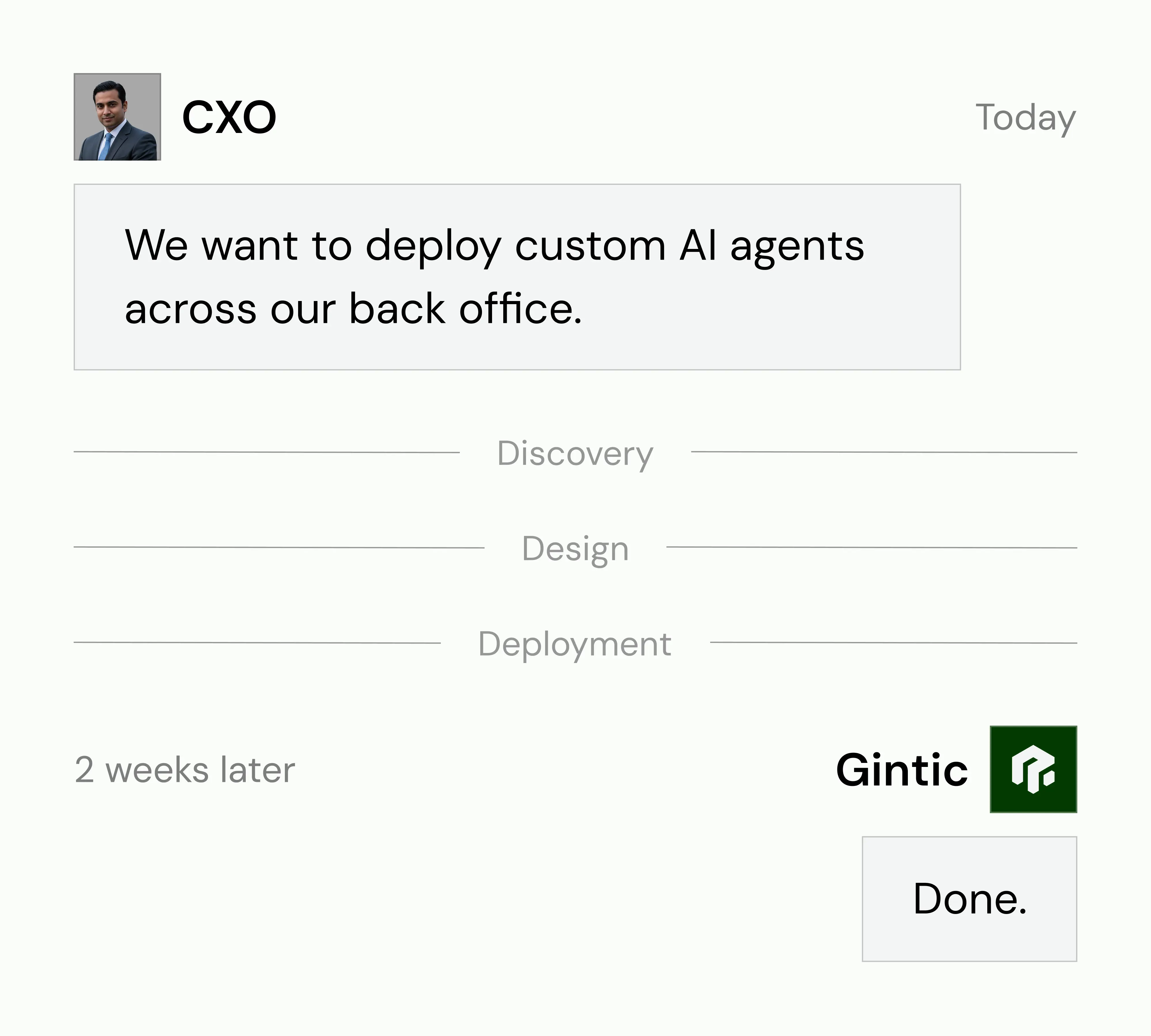 Kick-off to Production in 2 weeks. Discover, design and deploy workflows in record time with our embedded teams.
